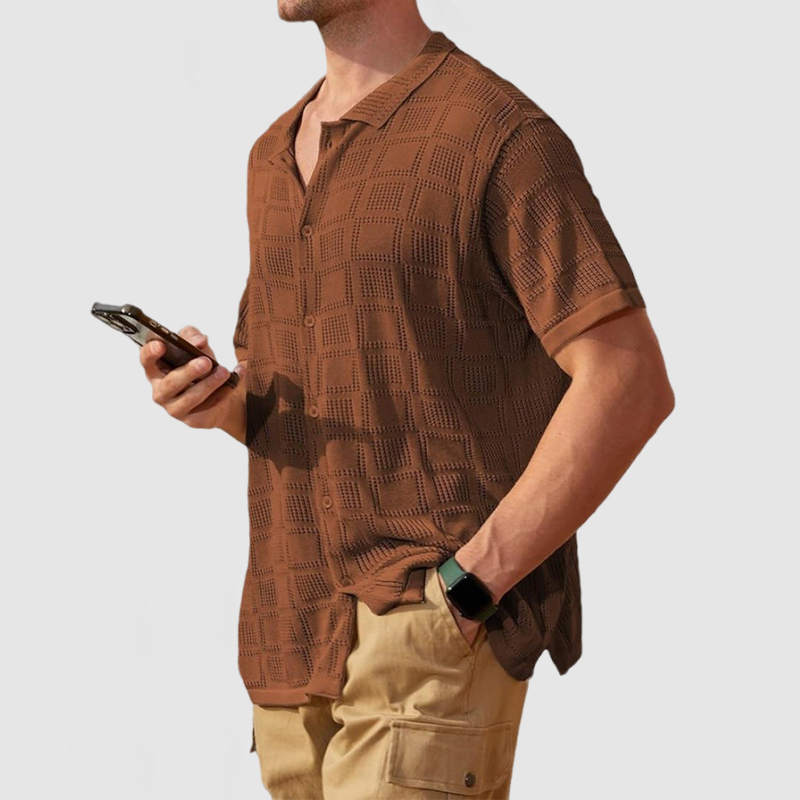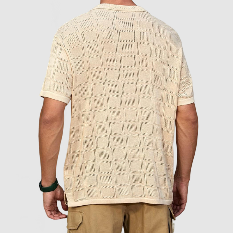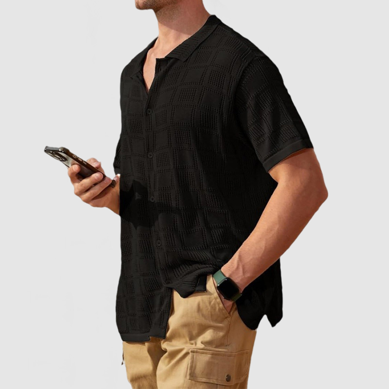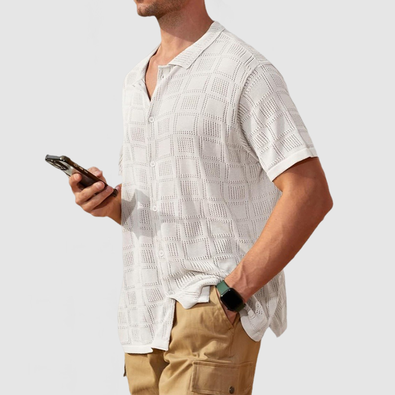 This shirt has a business-casual style element and is made from cotton, which is extremely breathable.This shirt is crafted from a breathable openwork knit fabric that's soft and cool to the touch, making it perfect for summer. With the innovative rectangular cutout design, the gentleman can still manage this shirt with ease. Whether for outdoor sports, leisure activities or social gatherings, this shirt will keep you elegant and gentlemanly for a long time.